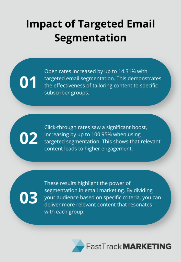 By targeting specific subscriber groups, you can increase open rates by up to 14.31% and click-through rates by 100.95% (Mailchimp, 2017). These numbers highlight the power of tailored messaging.